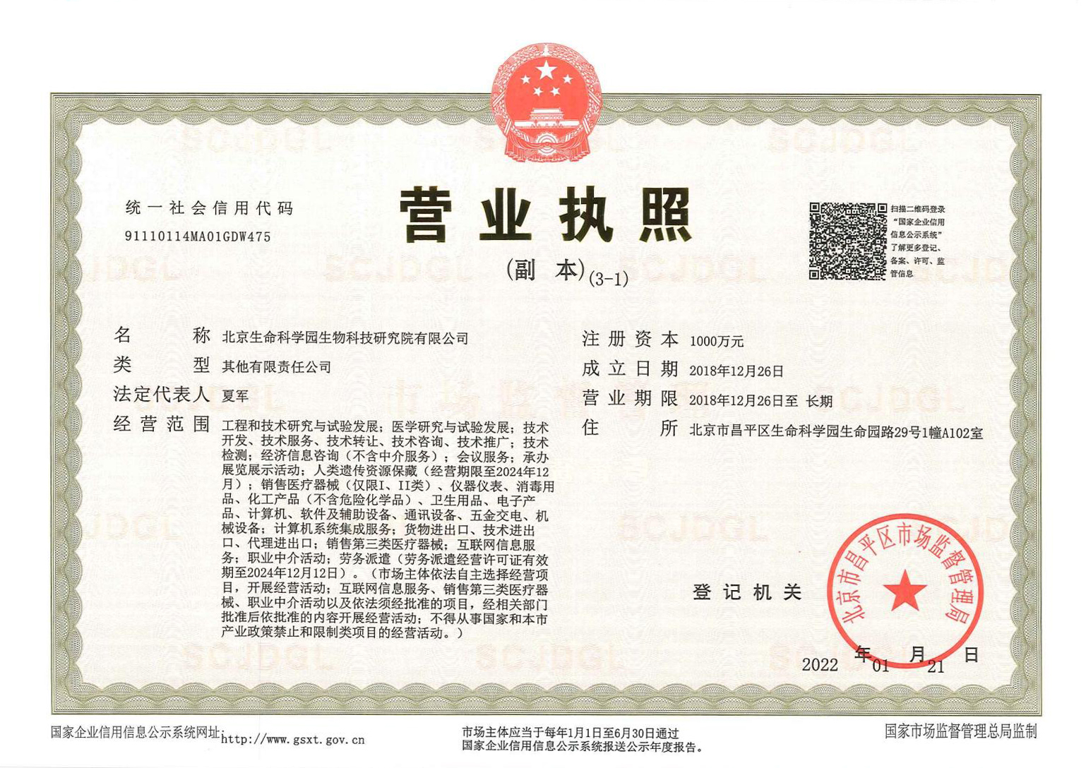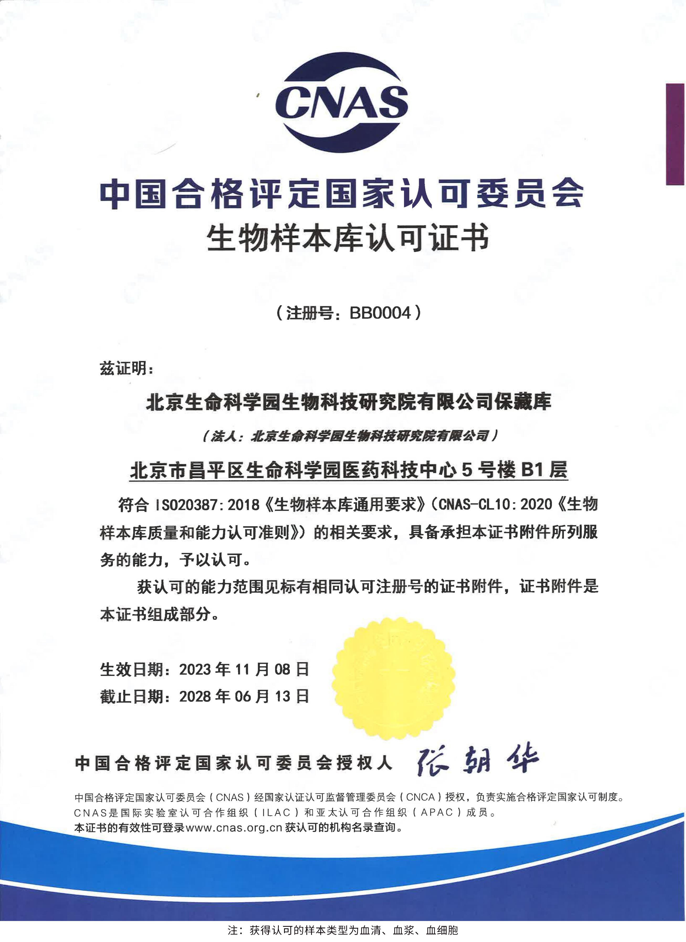 北京生命科學園生物科技研究院(以下簡稱“北京生物樣本資源庫”)(Biobank of Life Science Park,簡寫“BoLSP”)是一家由北京市科委和中關村生命科學園共同支持設立的第三方生物樣本庫公共服務平臺,秉承北京重大疾病臨床數據和樣本資源庫(以下簡稱“北京庫”)(Beijing Biobank of Clinical Resources,BBCR)十余年的發(fā)展成果,聚合眾多臨床樣本專家的專業(yè)共識,致力于在生命科學、生物醫(yī)藥研究領域發(fā)揮銜接樣本資源持有者與研究者的橋梁作用,解決生物樣本資源開發(fā)上下游信息不對稱、資源共享困難等問題。研究院在北京中關村生命科學園昌平園區(qū)建立了2000㎡生物樣本庫,最大存儲規(guī)模達1000萬份。研究院遵循CNAS-CL10:2020《生物樣本庫質量和能力認可準則》,同時結合北京庫過去十年的工作經驗與教訓,建立了一套完善的生物樣本保藏質量管理體系,從人、機、料、法、環(huán)、控多個角度,實現生物樣本保藏過程的全面質量控制,先后獲得國家科技部頒發(fā)的人類遺傳資源保藏行政許可證書和中國合格評定國家認可委員會(China National Accreditation Service for Conformity Assessment,CNAS)頒發(fā)的“CNAS認可證書”。
